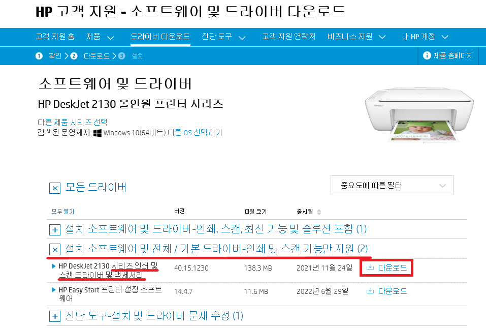 * HP 프린터의 종류마다 드라이버 다운로드 항목이 다를 수 있으니 참고하여 주세요.