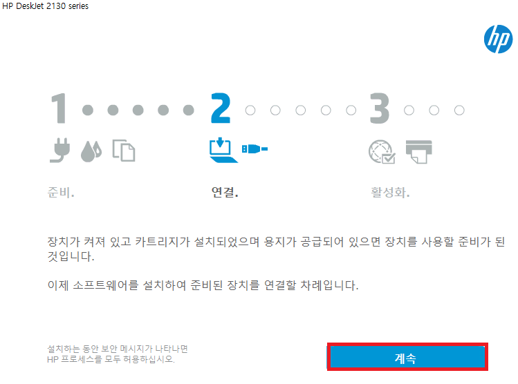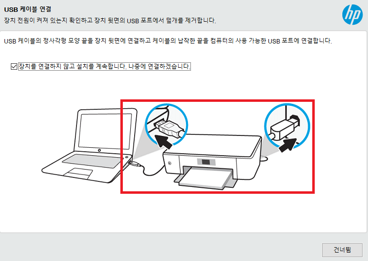 컴퓨터와 프린터 장치를 USB를 연결해 주시고 '계속' 진행해 주세요.