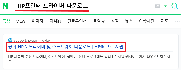 첫 번째로 자주 이용하는 인터넷 포털 검색창에 'HP 프린터 드라이버 다운로드' 입력하고 검색해 주세요. 검색 후 아래 보이는 'HP 드라이버 및 소프트웨어 다운로드'를 눌러 주세요.