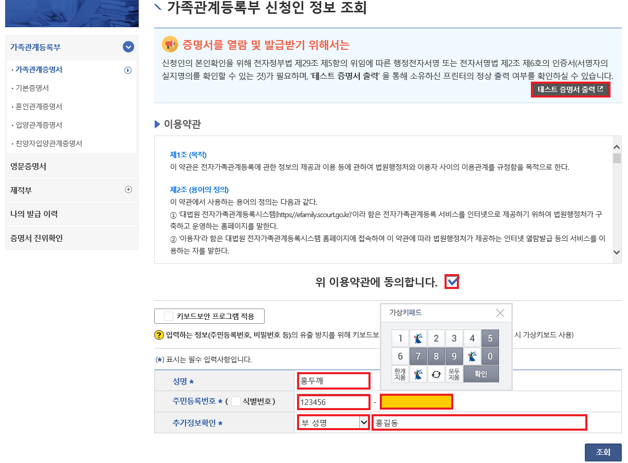 가족관계등록부 신청인 정보 조회 창이 보입니다. 이용약관에 동의해 주시고(v자체크) 아래로 내려가면 성명, 주민등록번호, 추가 정보 확인을 입력해 주세요!! ※ 성명, 주민등록번호 뒷자리는 가상 키패드로 입력하고 추가 정보 확인은 선택을 눌러서 해당되는 내용을 입력하면 됩니다.