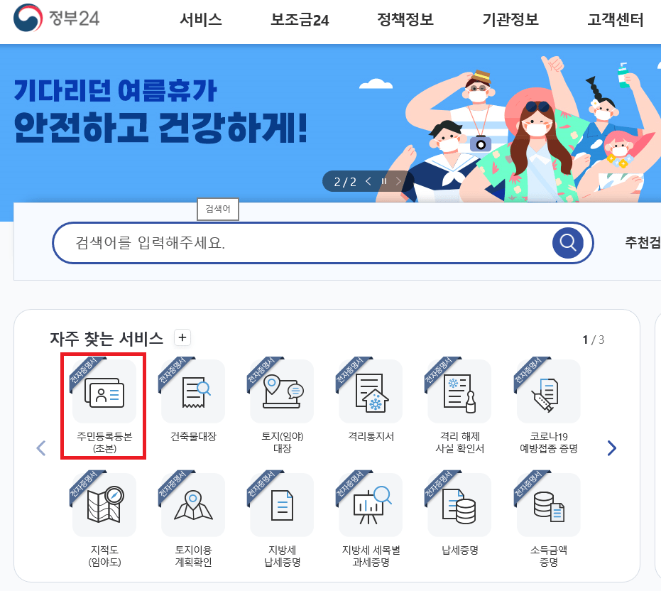 정부24시 홈페이지(www.gov.kr)에 접속하였습니다. 정부 24(민원 24)는 각 기관과 연계하여 신청·발급할 수 있는 서비스를 통합으로 제공하고, 현재 약 9만여 건의 서비스가 제공되고 있으며, 약 1,000여 건의 서비스 신청이 발급 가능합니다. 이제 주민등록등본을 인터넷으로 발급받기 위해 '자주 찾는 서비스'에서 '주민등록등본(초본)'을 눌러 주세요.