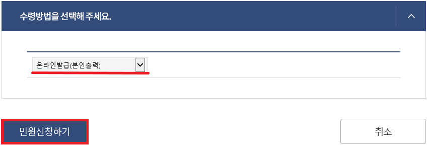수령방법은 프린터 인쇄를 하기 위해 온라인 발급 본인 출력을 선택하시고 '민원 신청하기'를 눌러 주세요.