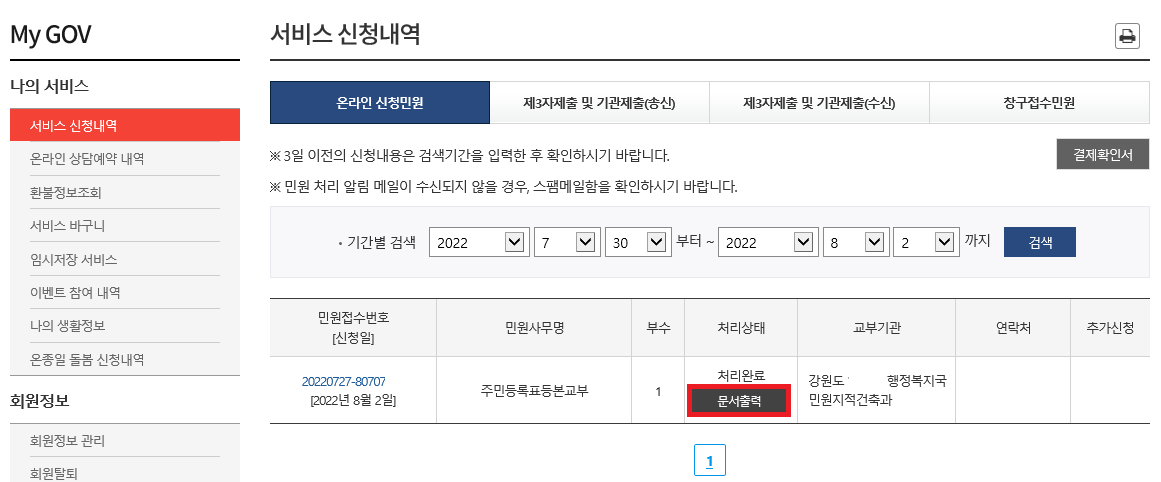 이제 My GOV에서 민원 서비스 신청내역을 확인할 수 있습니다. 주민등록등본을 출력하기 위해 My GOV에서 '문서 출력' 버튼을 눌러 주세요.