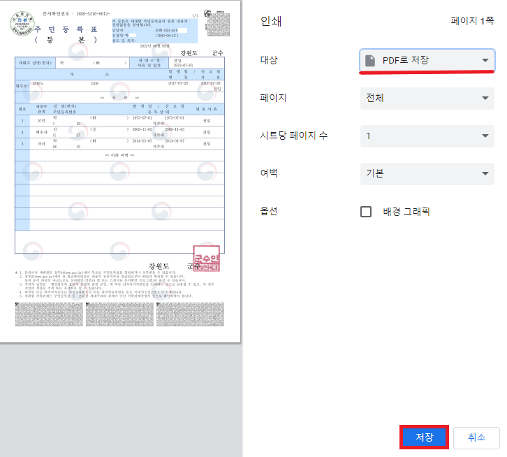 주민등록등본을 PDF로 저장하는 방법도 간단합니다. 인쇄 대상 기존 프린터에서 → 'PDF로 저장'으로 변경 선택해 주시고 아래 '저장'을 눌러 주세요.