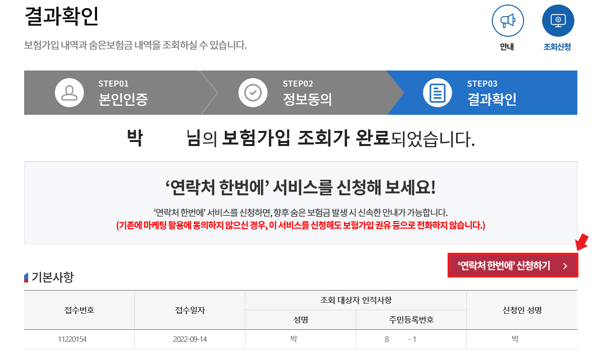 '내 보험 찾아줌' 결과 확인 화면으로 본인의 숨은 보험금 찾기 조회가 완료됩니다.. 이제 미청구 보험금, 휴면보험금을 조회 결과를 확인 하기 잔에 '연락처 한 번에 신청하기'를 눌러 신청인, 휴대폰 번호, 이메일 주소 등이 변동사항이 없는지 다시 한번 확인해 주세요. 연락처 한 번에 서비스를 신청하여 보험금 발생 시 신속하게 안내가 가능해집니다