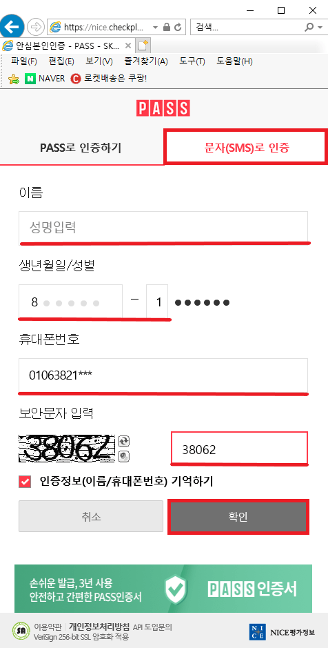 문자로 인증을 받기 위해 이름, 생년월일, 휴대폰 번호, 보안 문자를 입력하고 '확인'을 눌러 주세요.