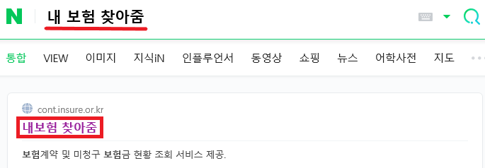 첫 번째로 자주 이용하는 포털 사이트 검색창에 '내 보험 찾아줌'을 입력하고 검색 후 아래 '내 보험 찾아줌'을 눌러 주세요.