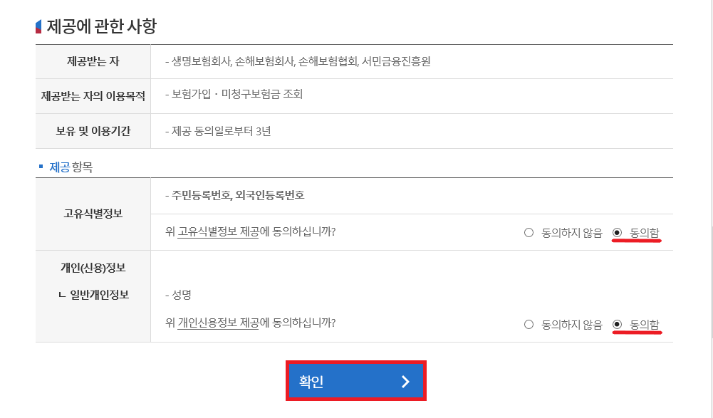 개인(신용) 정보 수집·이용 등에 관한 사항 동의에 체크해 주셔야 '내 보험 찾아줌'홈페이지에서 숨은 보험금 찾기·조회를 진행할 수 있습니다. 모든 동의에 체크 후 '확인'을 눌러 주세요.