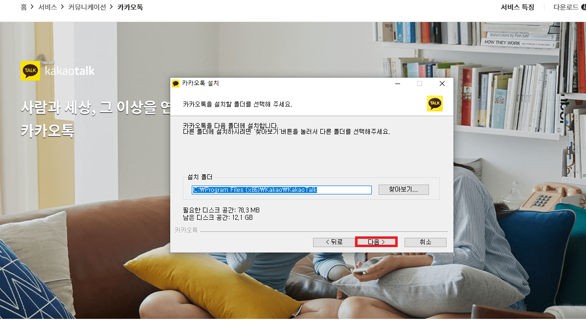 카카오톡 설치 화면이 보입니다. 아래 다음을 클릭하여 주세요.