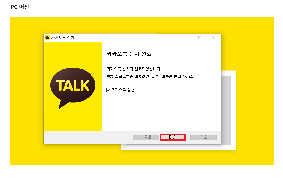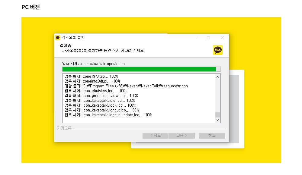 다음 화면으로 카카오톡 설치 중 압축해제가 되고 마지막으로 마침을 클릭하면 설치가 완료되고 PC 바탕화면에 카카오톡 바로가기가 보여 집니다.