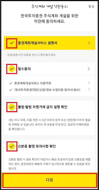 한국투자증권 주식계좌 계설을 위한 약관에 동의하시고 체크한 후 아래 다음을 클릭하여 주세요.