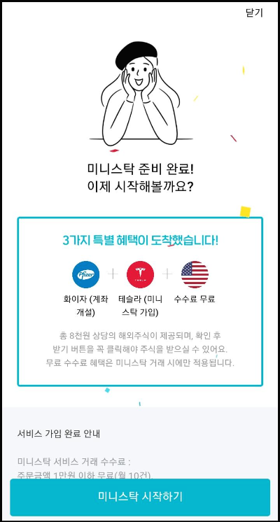 수고하셨습니다. 한국투자증권에서 주는 해외인기주식 1주와 미니스탁에서 주는 랜덤 주식 1주가 지급이 되었는데요. 저는 해외인기 주식으로 코로나바이러스로 인해 화이자를 선택했고 랜덤 주식으로는 2,000원 상당의 테슬라가 선택 되었습니다. 전기자동차하면 테슬라 인데 생각보다 괜찮은 주식이 나온 것 같아 기분이 좋습니다.