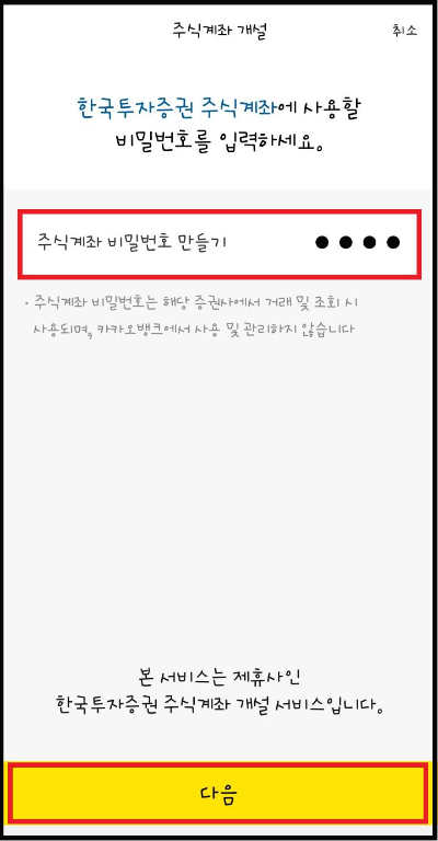 다음 화면으로 한국투자증권 주식계좌에 사용할 비밀번호 4자리를 입력하시고 다음을 클릭해 주세요.