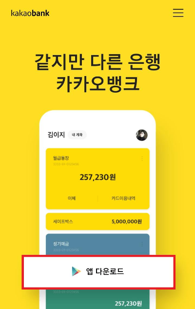 카카오뱅크 화면이 보이며 아래 앱 다운로드를 클릭하고 설치하여 주세요. (위에 설명에 말씀드렸듯이 카카오뱅크 입출금 계좌가 있어야 카카오뱅크 주식계좌를 만들 수 있으니 개설하여 주세요)