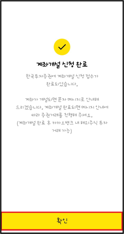한국투자증권 주식계좌 개설 신청이 접수되었습니다. 한국투자증권에서 순차적으로 계좌 개설이 진행되며 다소 시간이 걸릴 수 있으니 조금 기다리시면 완료 시 문자나 톡으로 연락을 주십니다.