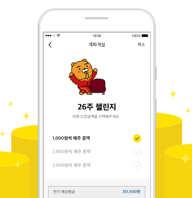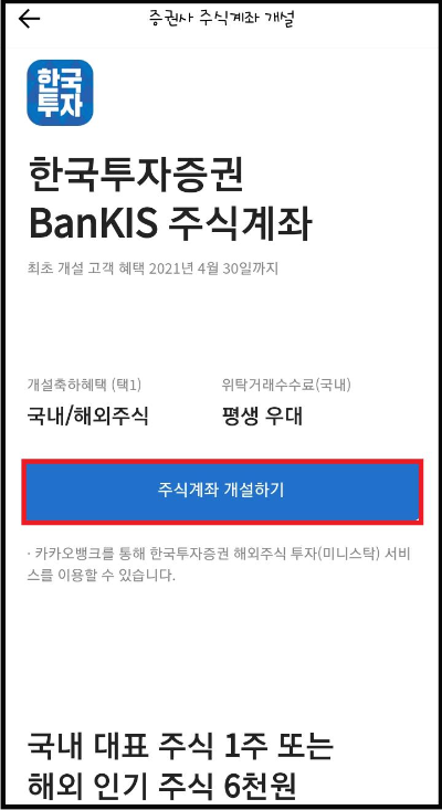 ▶최초 개설 고객 혜택으로 2021년 4월 30일까지 계좌 개설 시 국내 대표 주식 1주 또는 해외 인기 주식 6천원 가량의 주식을 제공합니다. 국내 주식은 지급 혜택은 KOSPI200에 포함된 종목으로 무작위 램던 방식으로 제공되고 주식을 신청한 고객에 한하여 3 영업일 후 입고됩니다. 해외주식 지급혜택은 카카오뱅크 앱을 통하여 해외주식 투자(미니 스탁) 서비스에서 제공됩니다.
