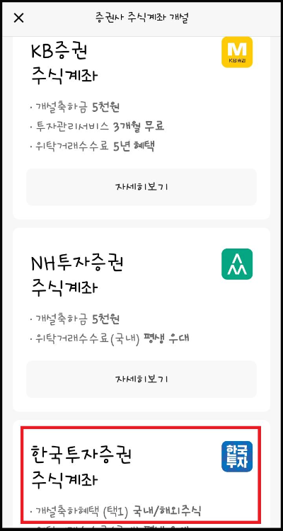 증권사 주식계좌 개설 화면입니다. 개설할 증권사를 선택하고 자세히 보기를 클릭하여 주세요. 저는 위에 말씀드린 대로 한국투자증권 주식계좌를 선택해서 진행하도록 하겠습니다.