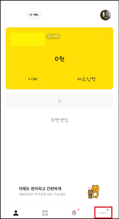 한국투주자증권 이벤트 참여 방법 입니다. 카카오뱅크 로그인을 하여 주시고 우측하단에 점모양 3개있는 빨간체크 박스를 클릭해 주세요.