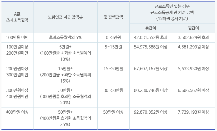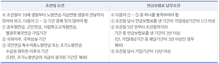 ※ 장애 연금을 받고 있는 수급자라도 18세 이상부터 60세 미만인 기간 동안은 국민연금 가입대상이 되며 근로 소득이나 사업소득이 있는 경우에는 연금보험료를 납부해야 합니다.