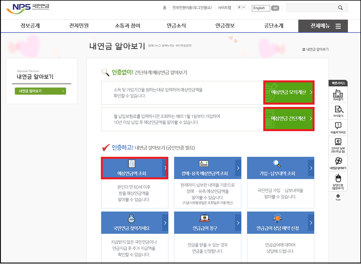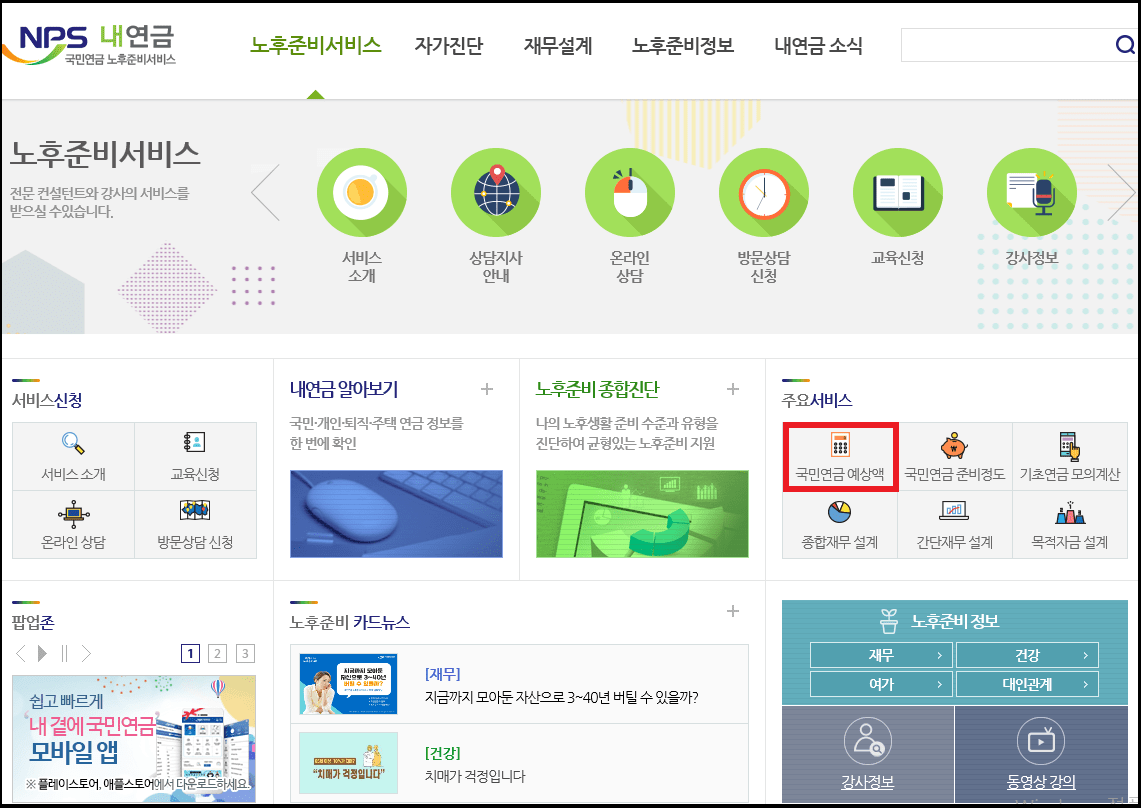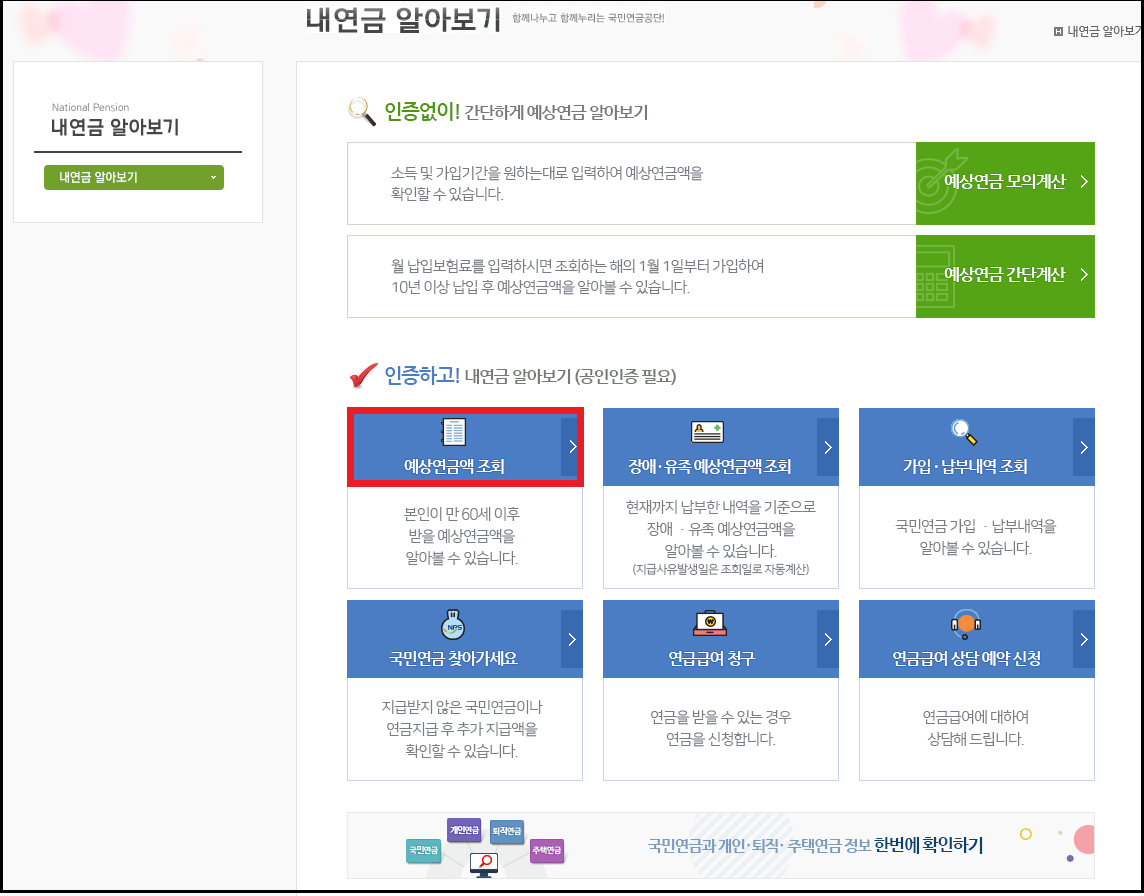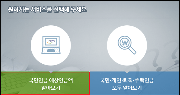 로그인이 완료되면 우측 하단 및 주요 서비스에서 국민연금 예상액을 눌러 주세요.