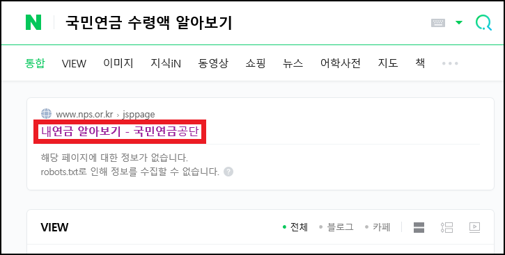 처음으로 자주 이용하시는 인터넷 포털사이트에서 "국민연금 수령액 검색" 하여 주시면 내연금 알아보기-국민연금공단 사이트가 검색이 됩니다. 사이트를 눌러 주세요.