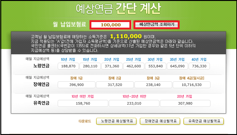두 번째 예상연금 간단계산 화면인데요. 제가 임의로 월 납입보험료에 100,000이란 금액을 입력하고 예상연금액 조회하기를 눌렀더니 노령연금, 장애연금, 유족연금 등 매월 지급 예상 연금액이 표시되고 저의 월 납입 보험료에 해당하는 소득기준은 1,110,000원이라고 나와있습니다.