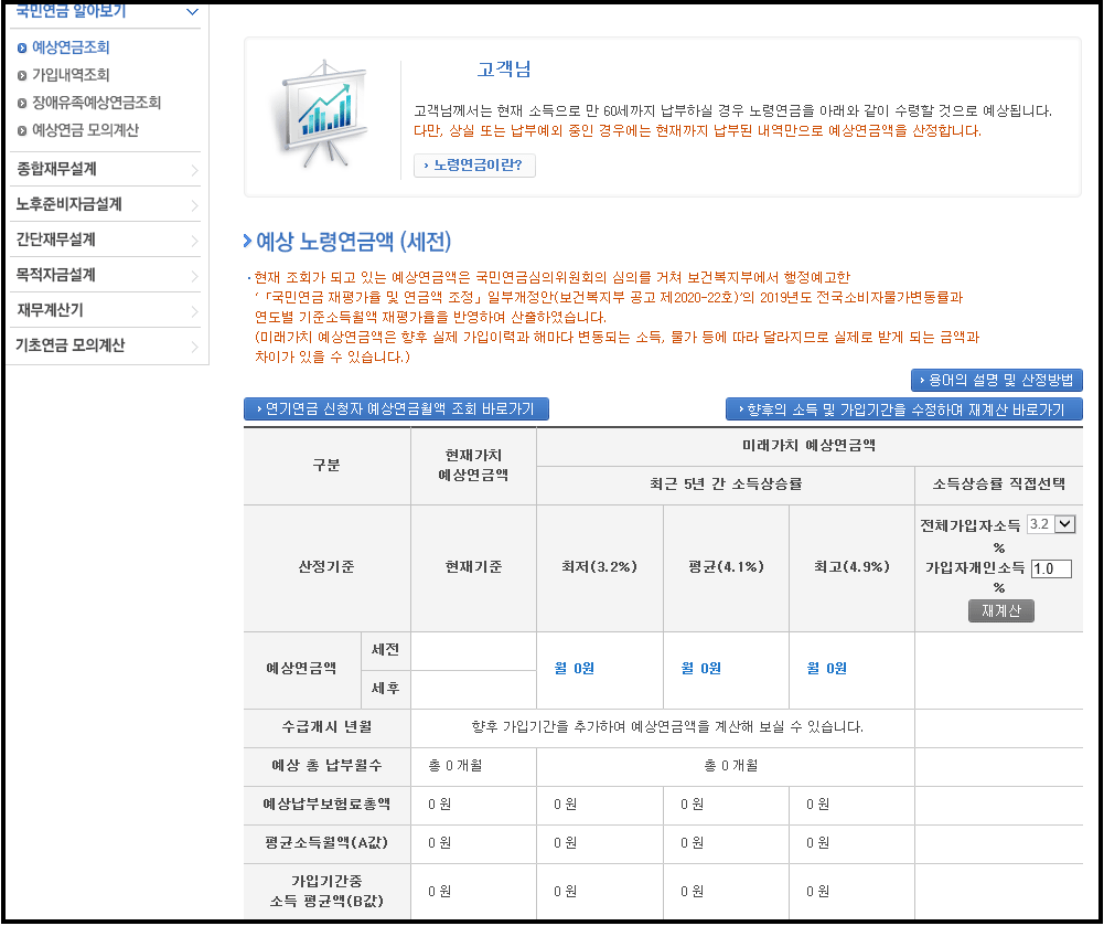 마지막 화면입니다. 현재 소득으로 만 60세까지 납부하실 경우 노령연금을 얼마나 수령할지 예상 노령연금액 화면이며 수령액을 확인하여 주시면 됩니다.