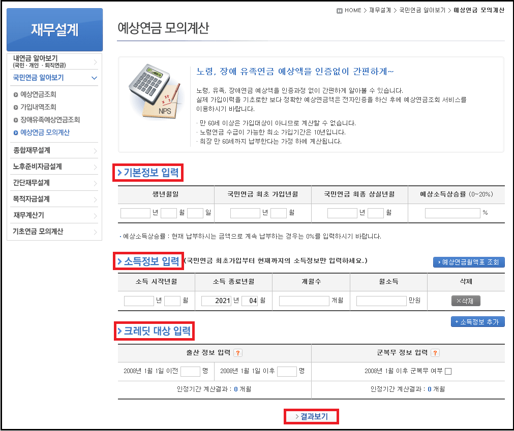 첫 번째 예상연금 모의계산 화면입니다. 아래 기본정보, 소득정보, 크레딧 대상 입력란에 입력을 하여 주시고 결과 보기를 눌러 주시면 예상 연금을 확인할 수 있습니다.