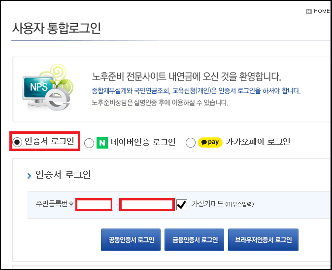 국민연금 수령액을 알아보기 위해 인증서 로그인이 필요합니다. 공인인증서가 공동 인증서로 바뀌면서 기존 인증서뿐만 아니라 네이버, 카카오페이 등 인증을 통해 쉽고 간단하게 로그인이 가능합니다. 저는 인증서를 가지고 있어 인증서로 로그인하고 진행하겠습니다.