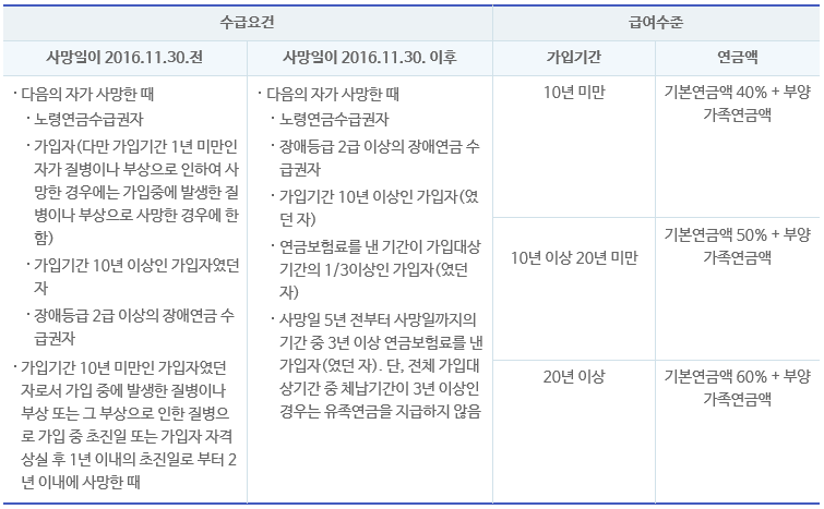 유족연금은 국민연금에 일정한 가입이 되어 있는 사람 또는 노령연금이나 장애등급 2급 이상의 장애 연금을 받던 사람이 사망했을 때 , 그에 의하여 생계를 유지하던 유족에게 가입되었던 일정률의 기본 연금액에 부양가족 연금액을 더하여 지급하므로 가족들에게 안정된 삶을 살아갈 수 있게 해주는 연금입니다.