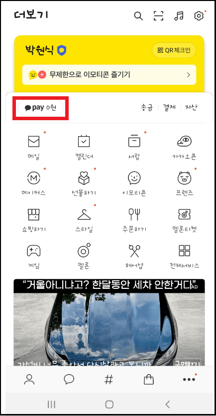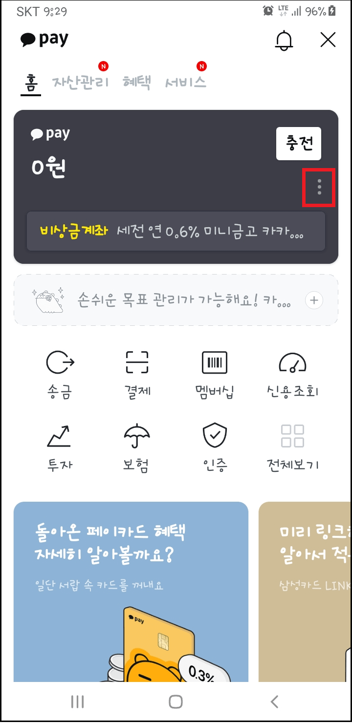 다음 카카오페이 화면이 보이며 오른쪽 상단에 3개점을 눌러주세요.
