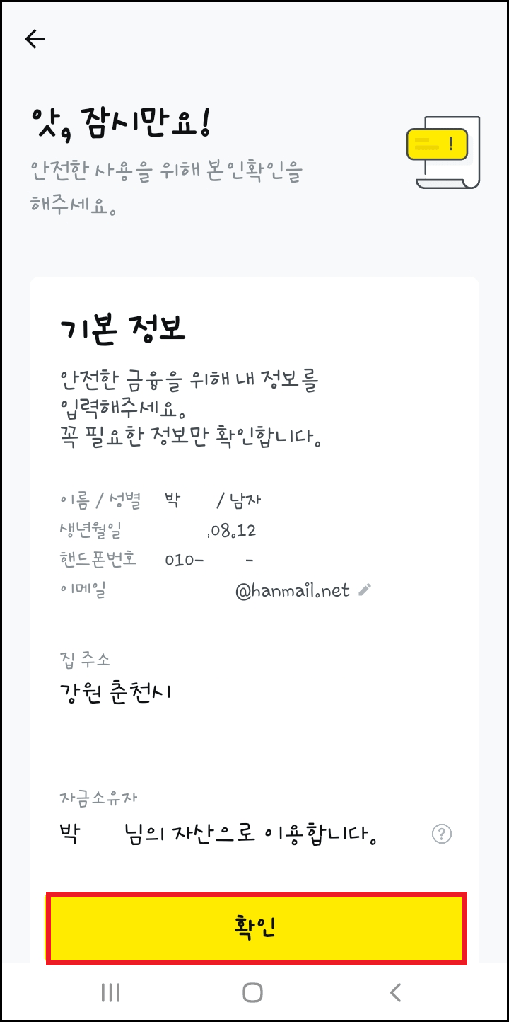 다음 화면입니다. 안전한 금융을 위해 내 기본정보를 다시 한번 확인하여 주시고 본인 확인이 정확하다면 확인을 눌러주세요.