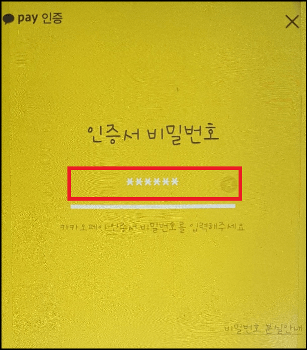 카카오페이 인증이 완료되면 카카오페이 인증서 비밀번호를 입력해야 합니다. 비밀번호 5회 오류 시 인증서 초기화되오니 신중하게 입력해 주시기 바랍니다.