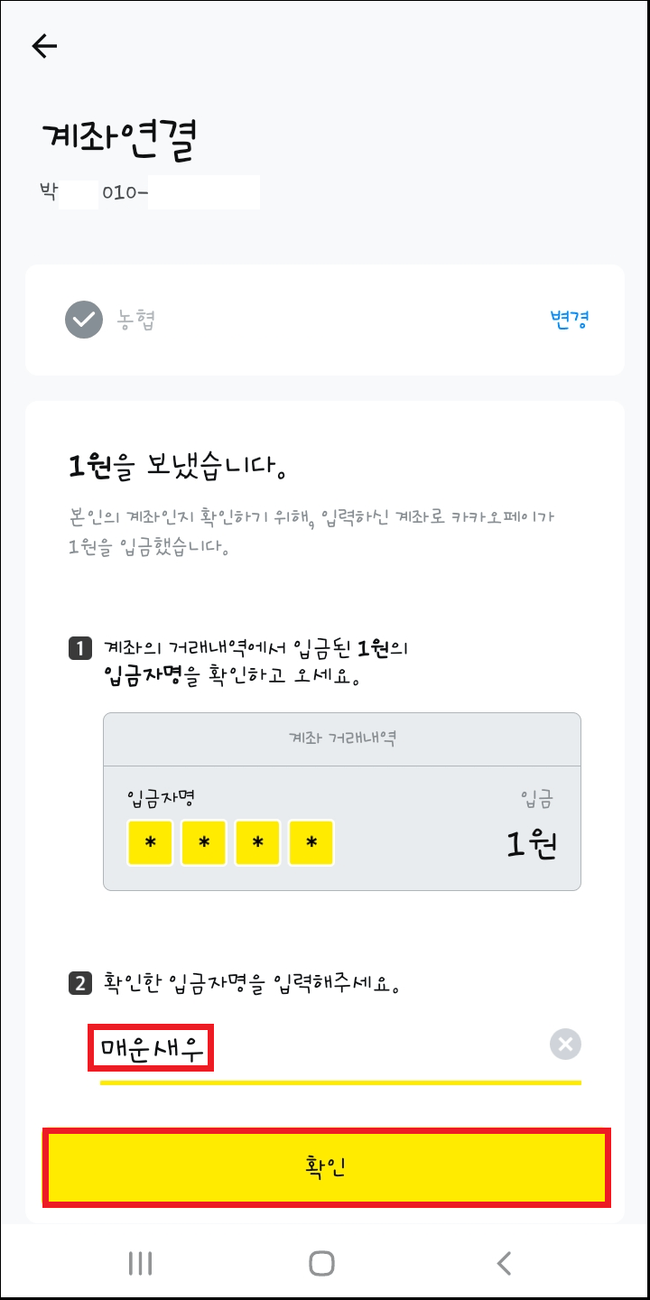 계좌 연결이 되었고 카카오페이에서 1원을 보냈다고 확인이 됩니다. 이제 연결된 계좌번호의 거래내역을 확인하기 위해 인터넷뱅킹 등을 이용하여 카카오페이에서 보낸 4글자 입금자명을 확인하고 입력해 주세요. 입력이 되었다면 확인을 눌러주세요. 아~ 저는 확인 결과 4글자 입금자명이 '매운 새우'가 나왔고 단어가 재미있어 보입니다.
