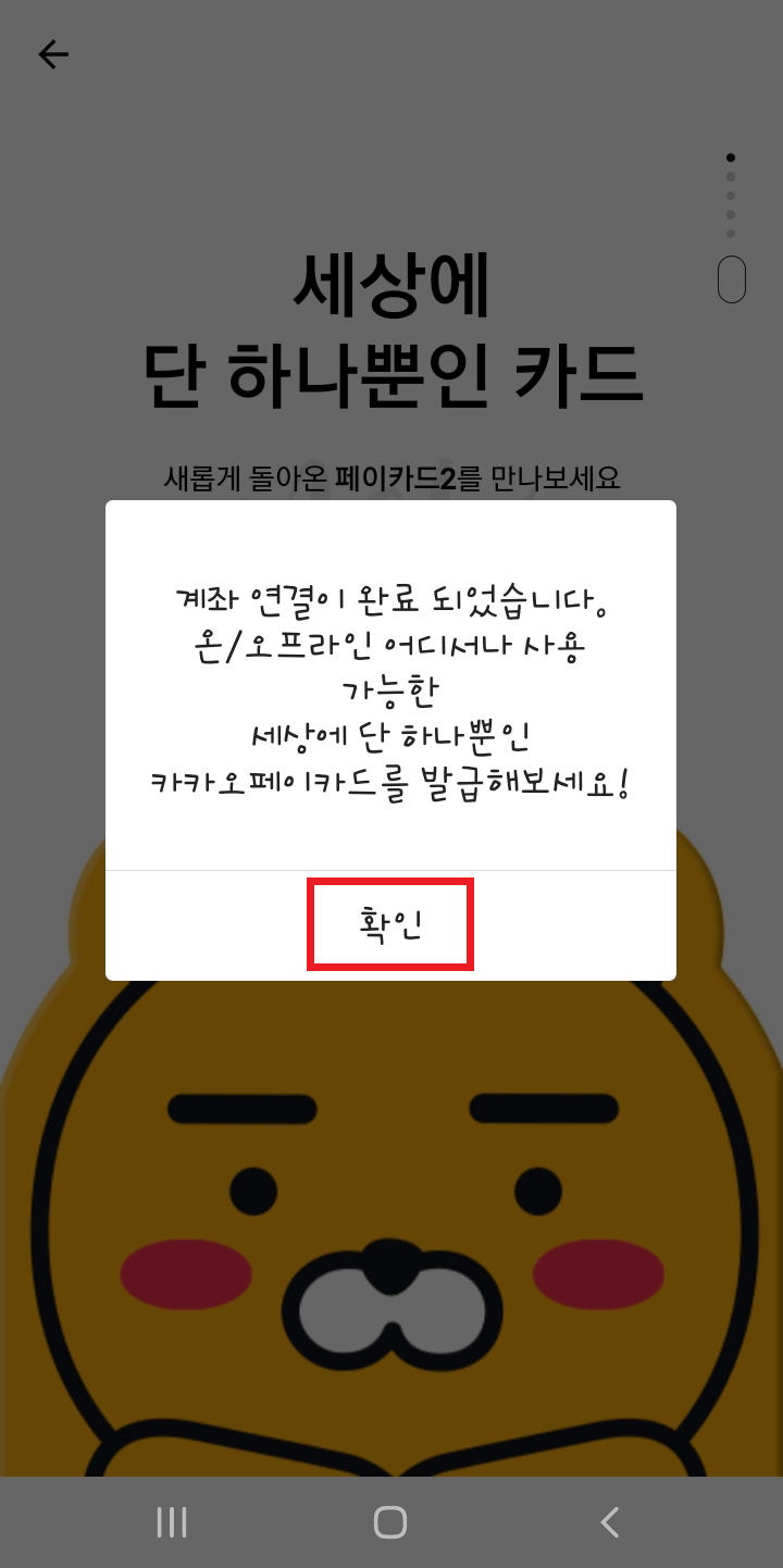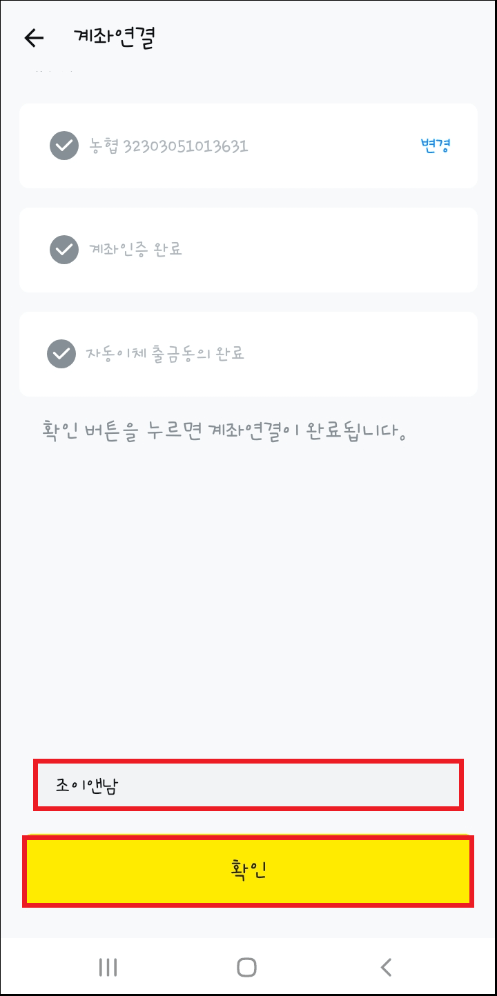 고생하셨습니다. 카카오페이 계좌 연결이 완료되었습니다. 확인 눌러주시면 마무리 되십니다.