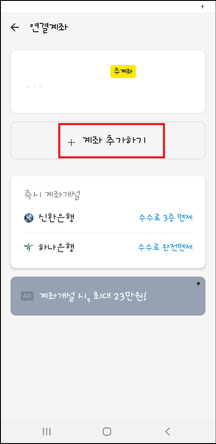 연결계좌 화면으로 계좌 추가하기 전 아래에 신한은행, 하나은행 수수료가 면제 혜택이 있습니다. 참고하여 주시고 저는 계좌 추가하기를 눌러 진행하도록 하겠습니다.