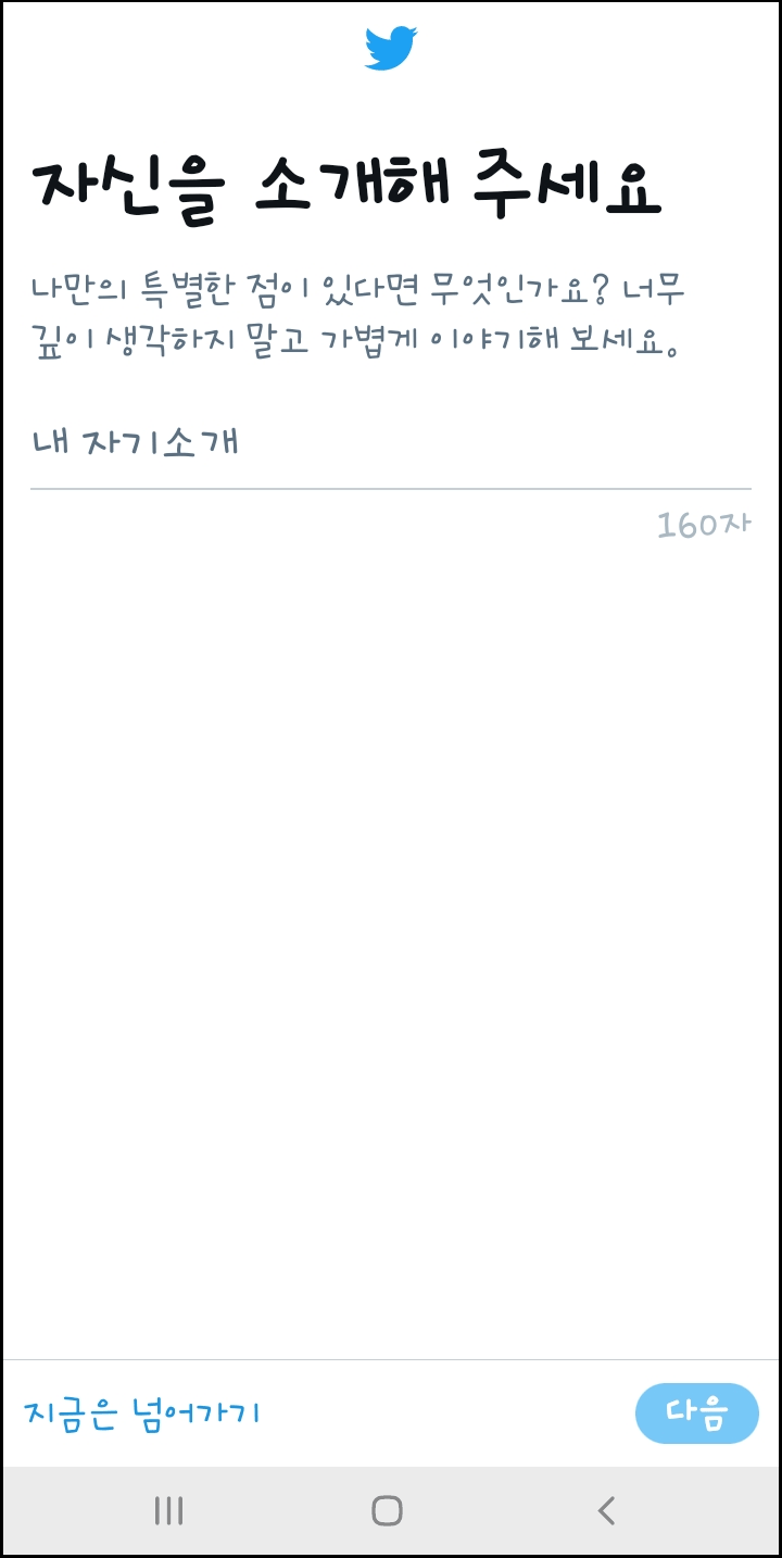 다음 화면으로 프로필 사진 선택, 자신소개 화면이 나옵니다. 자신이 원하는 사진으로 프로필 업로드 가능하며, 언제든지 수정이 가능하니 바로 설정 안 해도 됩니다. 자기소개서도 입력 가능 하지만 동일하게 나중에 입력해도 상관없습니다. 저도 나중에 입력하기로 하고 지금은 넘어가기로 하겠습니다.