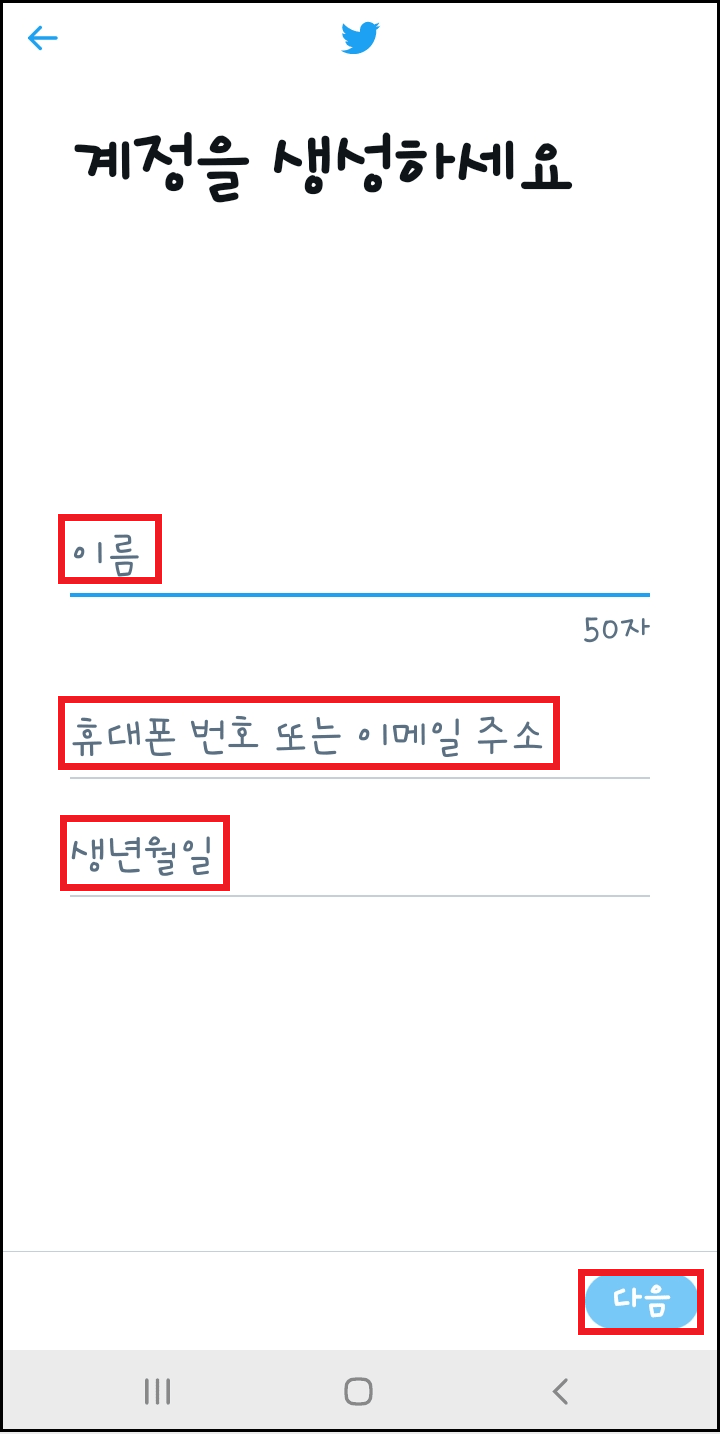 계정 생성을 위해 이름, 휴대폰 번호, 생년월일을 입력하여 주시고 다음을 눌러 주세요.
