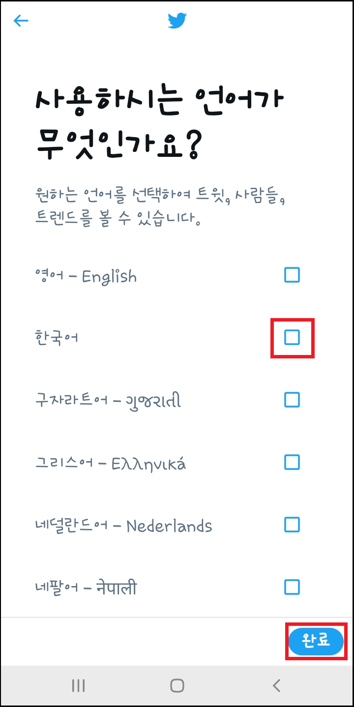 원하는 언어를 선택하면 트윗, 사람들, 트렌드를 볼 수 있습니다. 해당되는 언어를 체크하여 주시고 완료를 눌러 주세요.