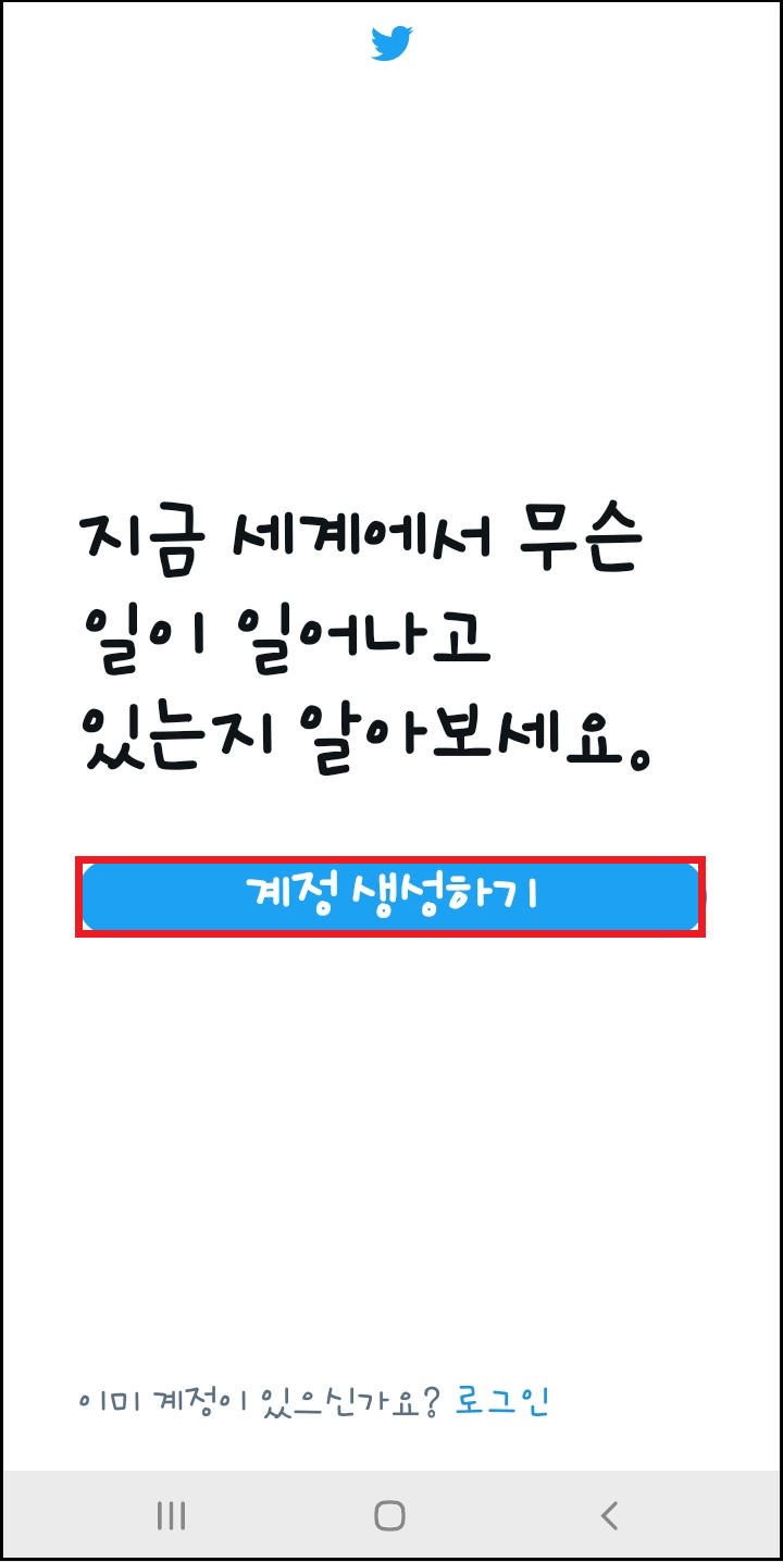 트위터 설치가 완료되면 열기를 눌러 주시고 다음 화면으로 계정 생성하기가 보입니다. 계정 생성하기 눌러 주세요.