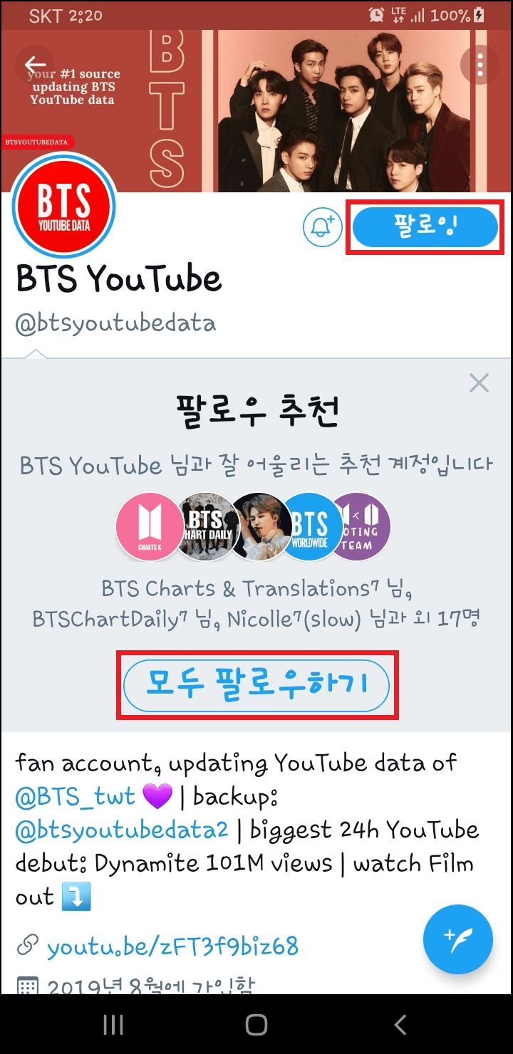 제가 선택한 추천인 화면이 보이고 상단 우측에 팔로우하기를 클릭하니 팔로잉으로 바뀌었으며, 제가 선택한 추천인 모든 계정의 모두 팔로우하기가 가능해집니다. 이상입니다.