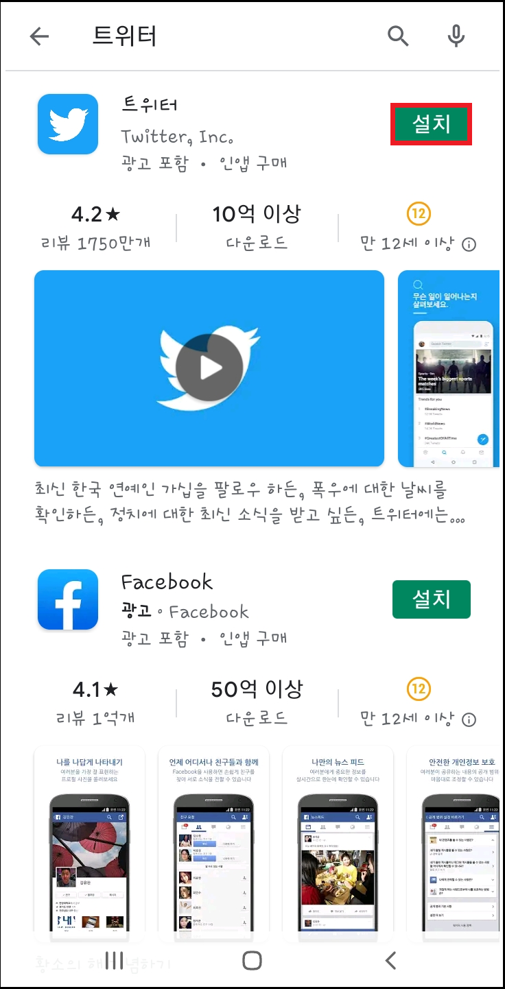 첫 번째로 트위터 계정을 만들려면 구글 플레이스토어 및 애플 앱스토어에서 '트위터'를 검색하고 다운로드하여 주세요. 트위터 화면이 보이며 오른쪽 상단에 설치를 눌러 주세요. 저는 휴대폰을 이용한 계정 만들기를 진행하겠으며 PC 설치 시에는 휴대폰 가입하는 방법과 동일하니 상관없으십니다.