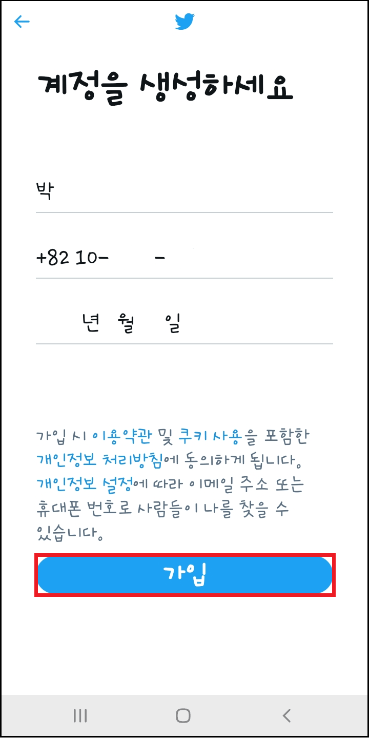 다음 화면으로 계정 생성하기 위해 입력했던 이름, 전화번호, 생년월일이 보입니다. 수정이 필요하다면 수정 부분을 눌러 변경이 가능하며 이상이 없다면 가입을 눌러 주세요.