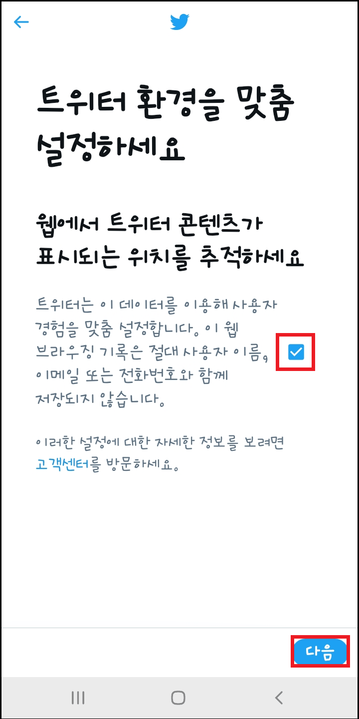 트위터 환경 설정 화면입니다. 내용 확인하시고 체크에 동의 후 다음을 눌러 주세요.