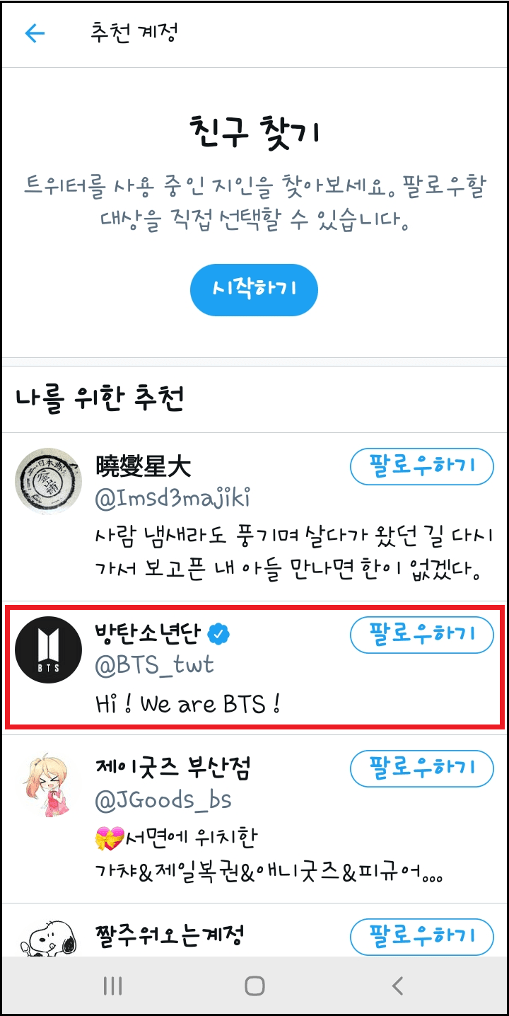 추가적으로, 지인을 찾아볼 수 있도록 친구 찾기가 가능하며 나를 위한 팔로우할 사람들을 추천해 줍니다. 제가 아래 추천인을 클릭해 들어가 보겠습니다.