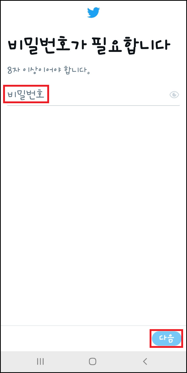 코드번호 입력 후 비밀번호 입력 화면입니다. 해킹 위험을 줄이기 위해 다른 사람들이 예상하지 못할 만한 비밀번호 8자 이상에 비밀번호를 입력하고 다음을 눌러 주세요.