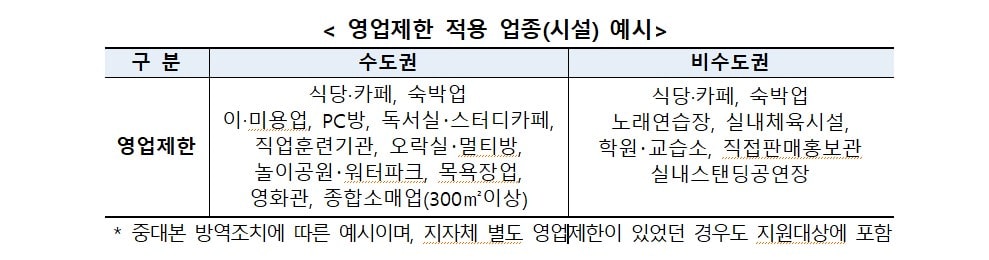 □ <영업제한> 중대본·지자체가 '20.11.24~ '21.2.14일까지 시행한 방역조치로 영업이 제한되어 '20년 매출이 전년 대비 감소한 사업체 300만원 지원됩니다.(영업제한은 일정 기간 사업체나 시설 전체의 영업시간 단축 또는 일정 기간 시설 일부의 이용 중단을 의미합니다)