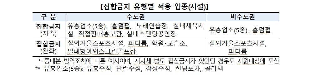 □ <집합금지> 감염병법 예방에 따라 중대본·지자체가 '20.11.24~ '21.2.14일까지 시행한 집합 금지된 사업체입니다.