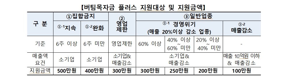 3. 소상공인 버팀목자금 플러스 지원 대상 및 지원 금액