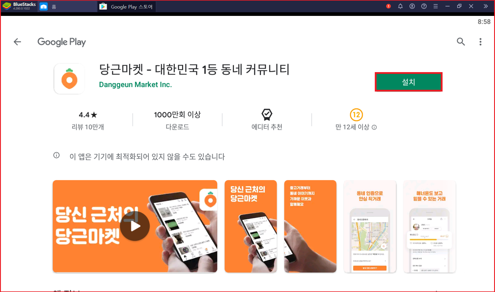 블루스택 우측 상단 검색창에 당근마켓을 검색하고 좌측 검색결과에 나와있는 당근마켓 앱을 누른 후 설치하여 주세요. 당근마켓 설치 후 구글 인증화면이 나오니 전화번호 및 비민번호 입력 후 로그인 하여 주세요.